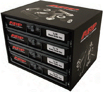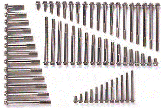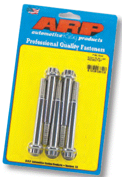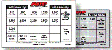 | Now you can use premium quality ARPstainlesssteel or chrome moly fasteners to install most anything on a car, boat or trailer. ARPsspecially alloyedstainlesssteel bolts and heat-treated 8740 chrome moly bolts with black oxide finish are nominally rated at 180,000 psi tensilestrength to provide asubstantial extra margin ofsafety over Grade 8 hardware. Whats more, you cant beat the gorgeous looks of ARPsspecially polishedstainlesssteel fasteners, and their ability to resist rust. Theyre truly maintenance free! You can get 5-packs of any Dia. bolt from #10 to 1/2" or M6 to M12 in lengths ranging from 1/2" to 6" in your choice of hex or 12-point heads with washers included. Matching nuts are also available (see pages 126-128). |