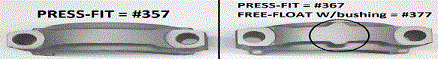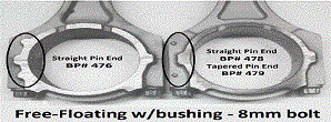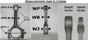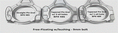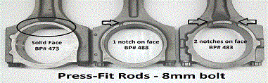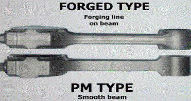 | Fractured cap/ broken Rod that is fractured at the parting line, leaving a rough and uneven surface. Machined cap - Rod that is machined smoothly at the parting line between cap and rod. Forged type Rod with a thick forging line running down the side of the beam. Pm/ smooth type Rod made from powdered metal with a smooth texture. Pm and forged refer only to the consistency of metal and general appearance of rods, and have nothing to do with how the caps are machined. Both forged and pm rods can have either machined or fractured caps. ALL PART #S ARE STANDARD SIZE. FOR .002 OVERSIZED RODS, ADD OS AT THE END OF PART # e.g. 447os. (only available on broken rods) ALL RODS WITH BUSHINGS ARE FITTED TO SIZE. os means that the connecting rod housing bore has been honed out .002" larger and that requires and O/ D (outside diameter) set of bearings (sold seperately). |
