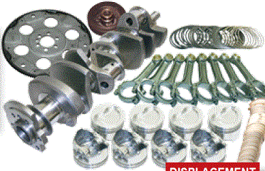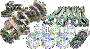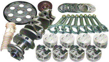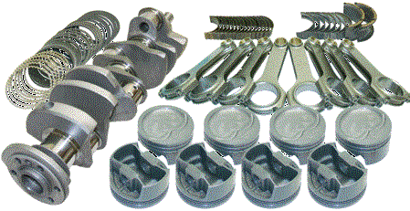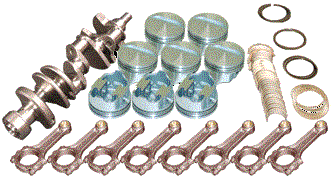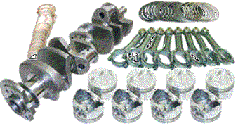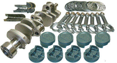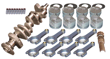 Forged 4340 steel crankshaft, forged 4340 steel H-Beam rods. 7/16 ARP L19 capscrew rod bolts (ARP 2000 available). Forged 2618 JE pistons and plasma-moly file fit rings. Performance racing bearings. Designed for internal balance with no heavy metal needed. Standard bore size is 4.125 |