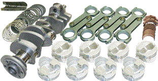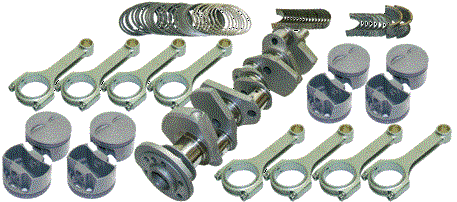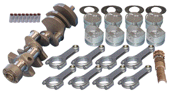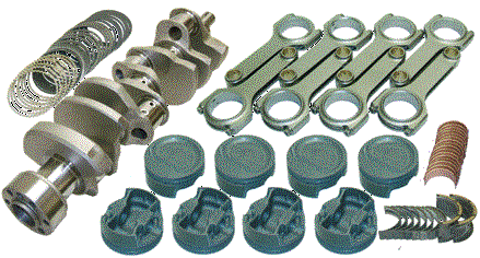 Cast steel crankshaft with performance street bearings. SIR forged 5140 steel I-Beam rods with 3/8 ARP 8740 rod bolts. Hypereutectic or forged 4032 pistons and plasma-moly rings. All kits must be balanced by qualified machine shop before use. Standard bore size: 4.125 Recommended for use in pump-gas, street engines. No power adders. |
