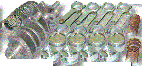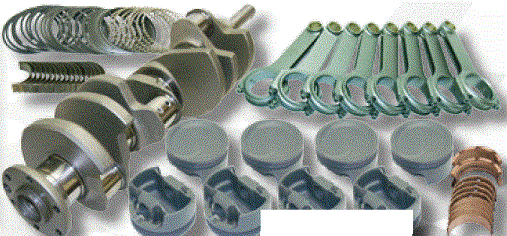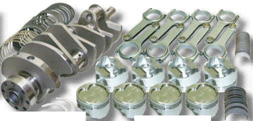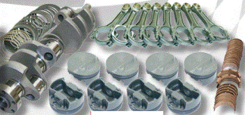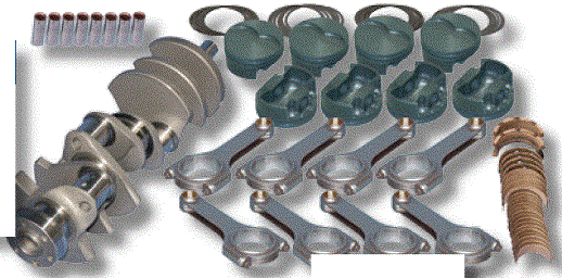 Cast steel crankshaft with performance street bearings. forged 4340 steel H-Beam rods with 3/8 ARP 8740 rod bolts. Forged 2618 pistons and plasma-moly rings. Recommended for use in pump-gas, street engines. No power adders. |