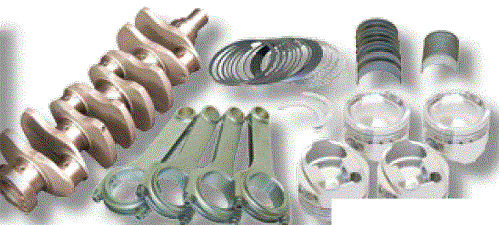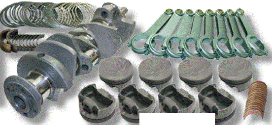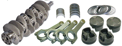 Cast steel crankshaft with performance street bearings. SIR forged 5140 steel I-Beam rods with 7/16 ARP 8740 rod bolts. Forged 4032 pistons and plasma-moly rings. All kits must be balanced by qualified machine shop before use. Recommended for use in pump-gas, street engines. No power adders. |