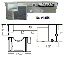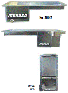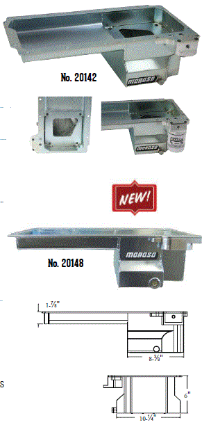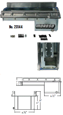 CHEVROLET BIG BLOCK Aluminum,Wet Sump, 6 Quart Capacity w/ Standard Volume Pump, 7 Quart Capacity w/ High Volume Pump, 8" Deep Engine Application: Mark IV style (except Gen V and Gen VI) Fits: Competition Eliminator, Super Gas, Super Comp and Bracket cars. Installation may require modifications to cross-member; check dimensions carefully before ordering Fully fabricated aluminum, billet end seals to ensure consistent sealing surface to billet front covers and rear main caps Utilizes graceh pan rail bolt pattern, recommended oil pan gasket, Fel Pro Part No. 1863 Double kick-out design ensures large stroke clearance and wide main cap clearance Solid louvered tray w/ main cap partitions for maximum power and oil control For use with 168-tooth flywheel combination Sump design works with Moroso spur gear and gerotor billet oil pumps Billet end seals ensure consistent sealing surface to billet front covers and rear main caps Accepts 4.75" with aluminum rods Features two 1/2" NPT Drainbacks