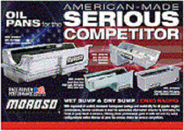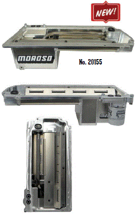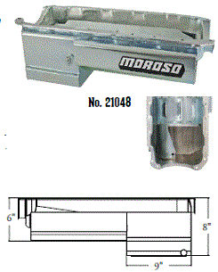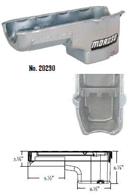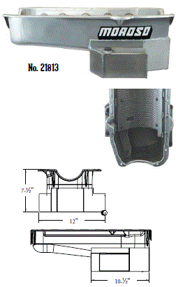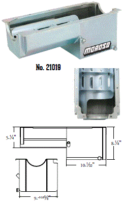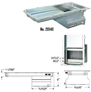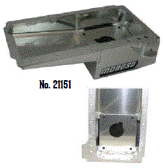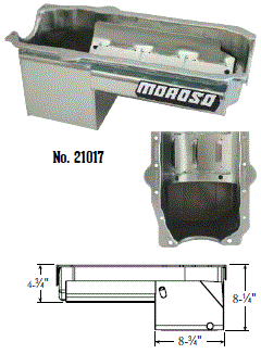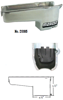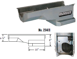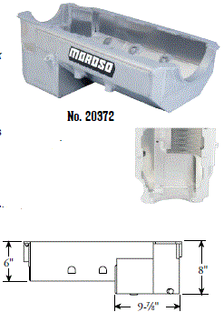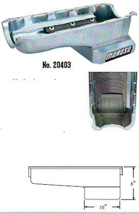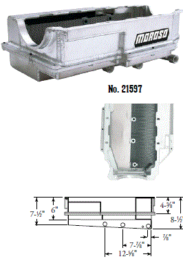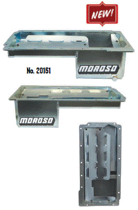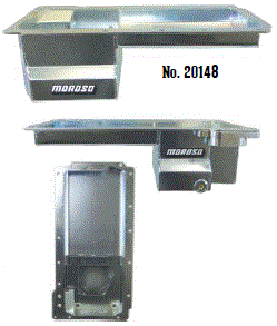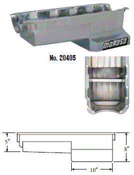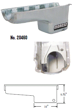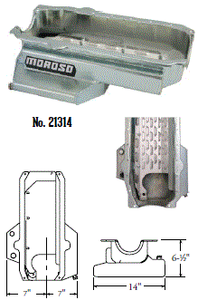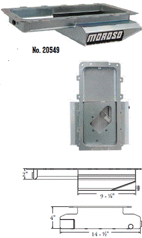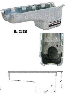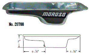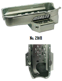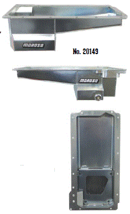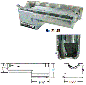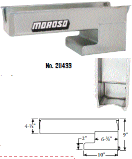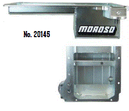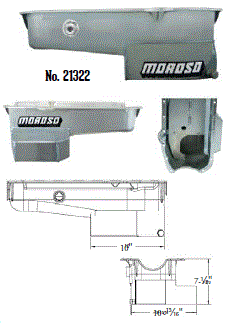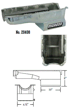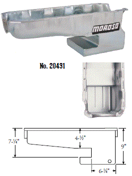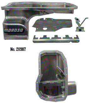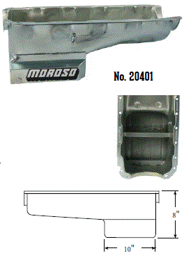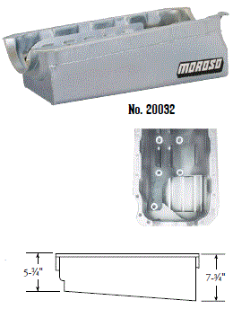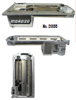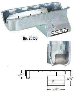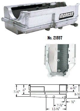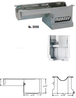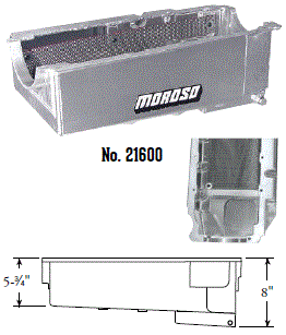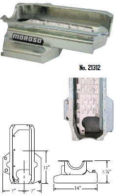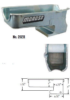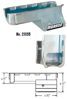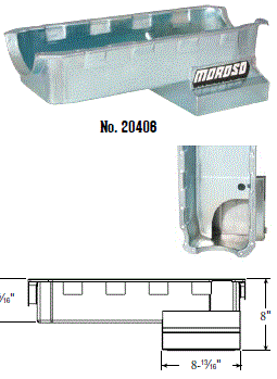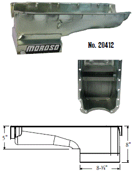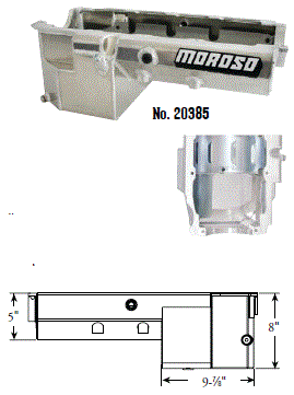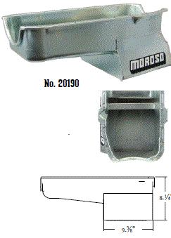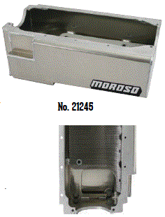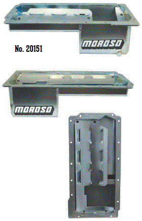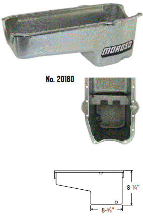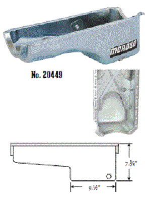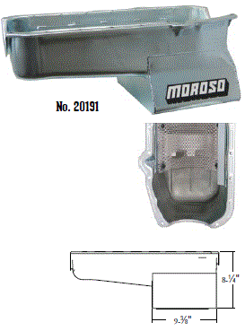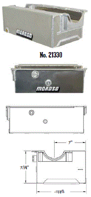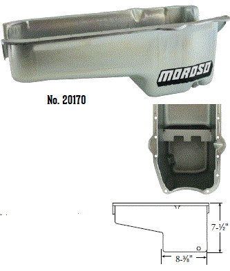 CHEVROLET BIG BLOCK Steel,Wet Sump, 7 Quart Capacity, 6" Front Depth, 8" Rear Depth Engine Application: Mark IV Style (except Gen V & Gen VI) Fits: Bracket and Budget Super Stock cars. Some modifications may be necessary to fit crossmembered cars. Core based oil pan Kick-out for horsepower savings Accepts 4.75" stroke with most steel rods, and 4.5" with most aluminum rods Partitioned and louvered windage tray with main cap dividers separates oil quickly from rotating assembly for ultimate oil control and maximum horsepower gain Includes provisions to accept Moroso Dipstick Kit Parts Nos. 25970, 25971, 25973 $79.45 Used with GM-style or Tilton-style starter and 168-tooth flywheel Clear zinc plating for durability and corrosion resistance