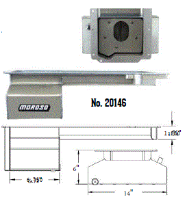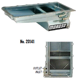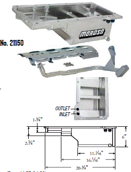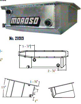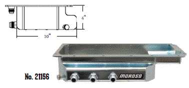 GM LS SERIES, REAR SUMP SWAP, ROAD RACE BAFFLED, REMOTE FILTER Steel,Wet Sump, 7 Quart Capacity Engine Application: GM LS Series Fits: 1968-'72 Nova, 1965-'72 Chevelle, 1967-'69 Camaro, Can also be used in additional applications; check dimensions for clearance Oil pan has a thick precision laser cut steel rail with a clear zinc finish Clears 4.125" stroke with most steel rods and can be used with Moroso No. 22941 $107.99 Windage Tray Front of the oil pan is 1-3/4" deep to the beginning of the 6" deep sump The sump is 9-11/16" long and 10-." wide Features a race proven diamond shape four trap door assembly and antislosh baffle that keeps oil contained in oil pump pick up area during road racing and drag racing The 7 Quart Capacity moves the oil away from the rotating assembly for oil control and horsepower saving Included billet aluminum adapter with two straight 10AN ports for remote filter installation Uses stock dipstick