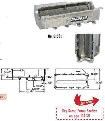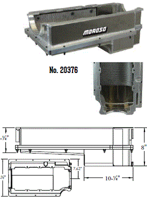 CHEVROLET BIG BLOCK Aluminum,Wet Sump, 6 Quart Capacity w/Standard Volume Pump 7 Quart Capacity w/High Volume Pump, 8" Deep Engine Application: Mark IV style (except Gen V and Gen VI) Fits: Competition Eliminator, Super Gas, Super Comp and Bracket Cars. Installation may require modifications to cross-member; Fully fabricated aluminum, billet end seals to ensure consistent sealing surface to billet front covers and rear main caps Utilizes graceh pan rail bolt pattern, recommended oil pan gasket, Fel Pro Part No. 1863. Double kick-out design ensures up to 4.75" stroke with aluminum rods, wide main cap clearance and maximum horsepower Solid louvered windage tray w/main cap partitions for maximum power and oil control Sump design works with Moroso spur gear and gerotor billet oil pumps Features two O-ring magnetic drain plugs, two .8AN drain backs, alternator notch For use with 168-tooth flywheel combination Pump adjustment bung with plug