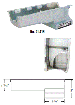 CHEVROLET BIG BLOCK Steel,Wet Sump, 6 Quart Capacity with Standard Volume Pump, 7 Quart Capacity with High Volume Pump, 8" Deep Engine Application: Mark IV Style (except Gen V & Gen VI) Fits: Bracket Race cars and Budget Super Stock cars; Some modifications necessary to fit cross-membered cars Core based oil pan Kick-out for horsepower savings 8" rear depth, 5" front depth with louvered steel tray Directional baffle across front of pan to direct oil to sump for oil control under hard acceleration For use with 168 and 153-tooth flywheel combinations Accepts 4.75" stroke with most steel rods, and 4.5" with most aluminum rods