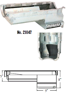 CHEVROLET BIG BLOCK Aluminum,Wet Sump, 6 Quart Capacity w/ Standard Volume Pump, 7 Quart Capacity w/ High Volume Pump, 8" Deep Engine Application: Mark IV style (except Gen V and Gen VI) Fits: Competition Eliminator, Super Gas, Super Comp and Bracket cars with no cross-member under engine Fully fabricated, aluminum; utilizes "race" pan rail bolt pattern Double kick-out design ensures large stroke clearance, wide main cap clearance and maximum horsepower Internal uni-directional screen and pan rail bolt access bungs For use with 168-tooth flywheel combination 1" deep mini sump design works with Moroso spur gear and gerotor billet oil pumps Billet end seals ensure consistent sealing surface to billet front covers and rear main caps Accepts 4.75" stroke with aluminum rods Recommended oil pan gasket, Fel Pro Part No. 1863