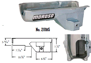 CHEVROLET SMALL BLOCK Steel,Wet Sump, 7 Quart Capacity, 7-1/2" Deep With 1" Inspection Bung to meet 2011 - Up IMCA Rules Fits: GM 1978-'87 Metric Chassis, aftermarket and Camaro front ends Accepts 4.125" stroke with steel rods, accepts most starter and flywheel combinations Fits 4 bolt Dart, GM and Merlin main caps Dimensions: 7-1/2" deep, 10" long by 10-13/16" wide sump Integrated 1" inspection bung with plug, no need for extra welding A cost-effective Circle Track Oil Pan with Moroso quality & performance was unavailable until now Trap doors for oil control, removable louvered windage tray and built-in crankscraper