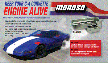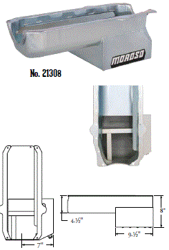 CHEVROLET SMALL BLOCK Steel, Wet Sump, 7 Quart Capacity, 7" Deep Sump, Road Race Baffled Fits: C-3 & C-4 Corvettes, Kit Cars and other low ground clearance applications . Clears 4.125" stroke with most steel rods Fits 4 bolt Dart, GM and Merlin main caps 5 trap door baffles for oil control in Road Racing, also an excellent Drag Race pan . Has a built-in crank scraper, removable louvered windage tray for horsepower Rear Sump is 7" deep, 13-7/8" wide and 12" long Includes 20mm fitting for oil level sensor, optional 20mm plug No. 22738, available for use when the factory low warning sensor is not going to be utilized Use stock dipstick; also has a 1/4" NPT fitting for Moroso Universal Dipsticks Nos. 25970, 25971, & 25973. Steel with a clear zinc finish Compatible with most starter/flywheel combinations