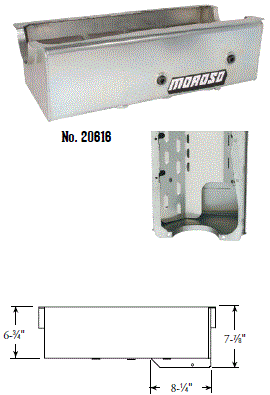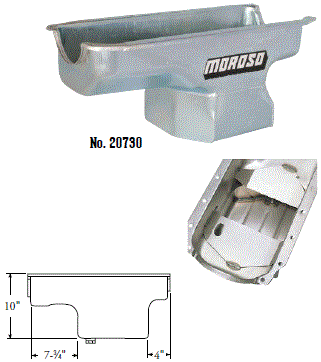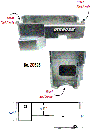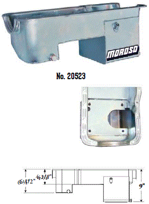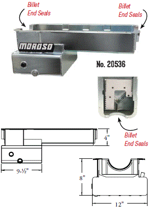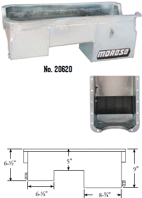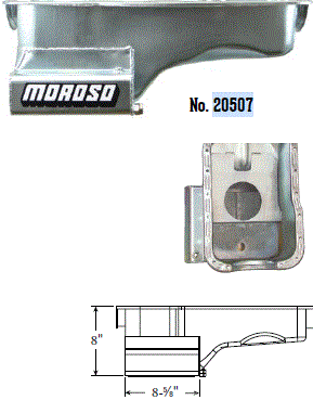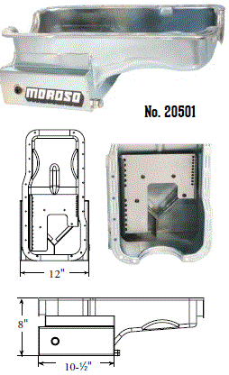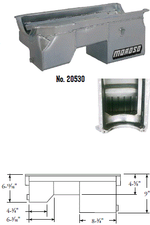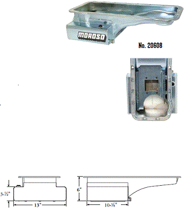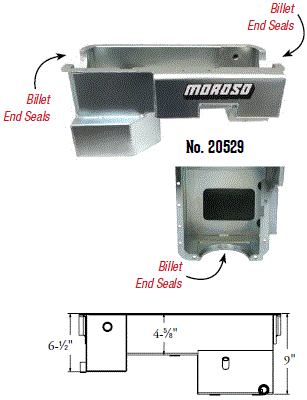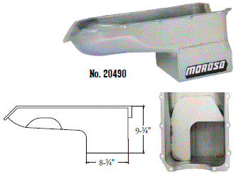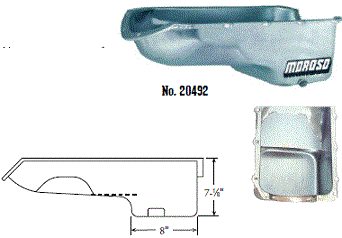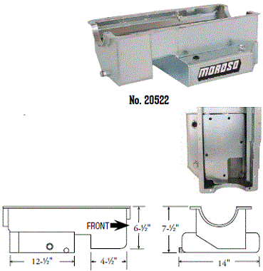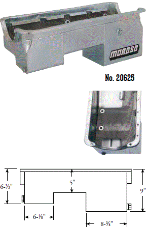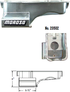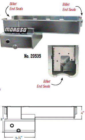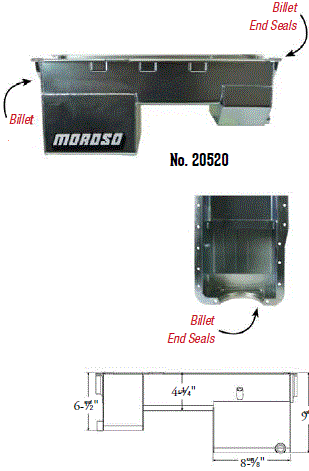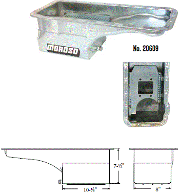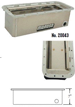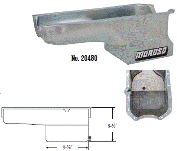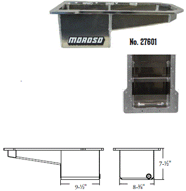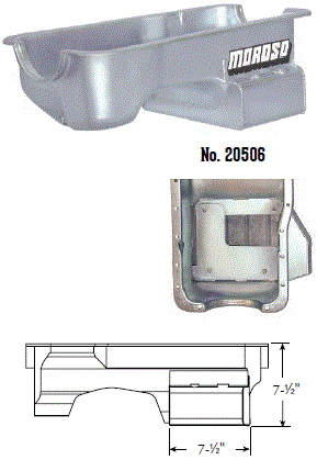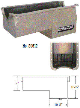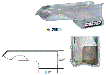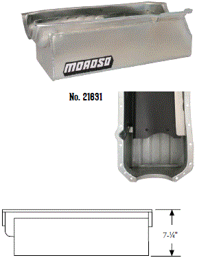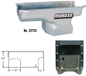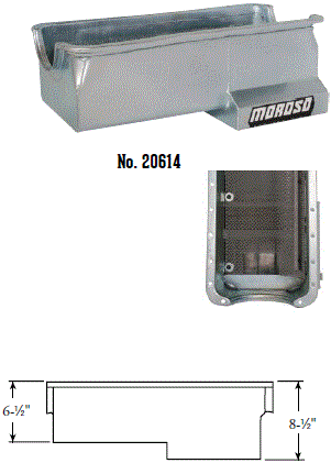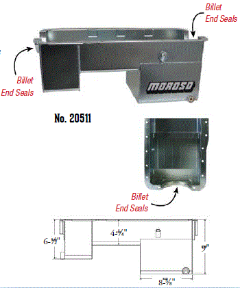 Steel,Wet Sump, 7 Quart Capacity, 8-1/2" Deep Engine Application: 429-460 Fits: Tube-chassis Bracket and Super Classes including dragsters, roadsters, door slammers, etc. . Core based oil pan, utilizing stock pan rail bolt pattern . Increased sump capacity, and trap door baffling . Provision for Moroso Universal Dipstick Nos. 25970, 25971, or 25973, . Stock starter with 184-tooth flywheel |