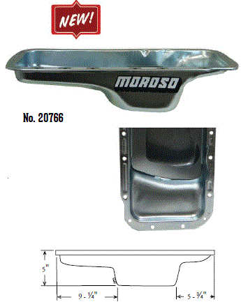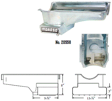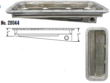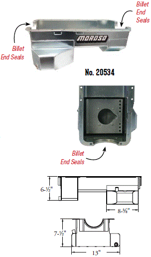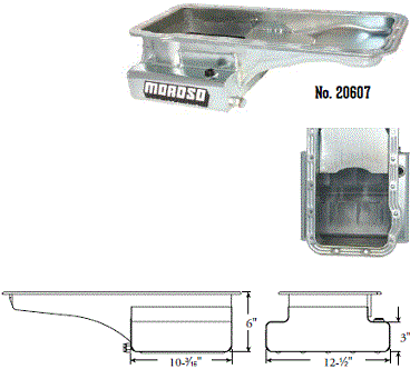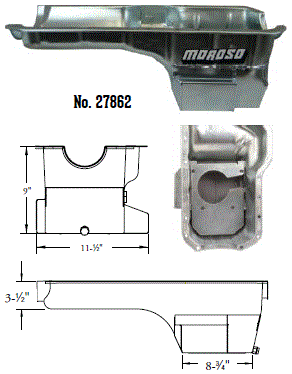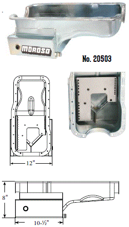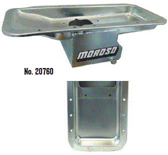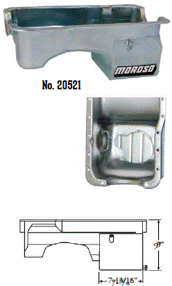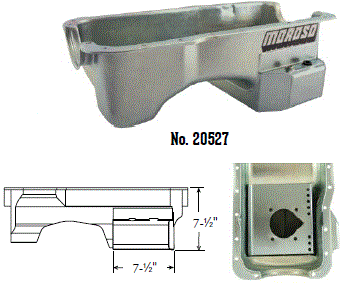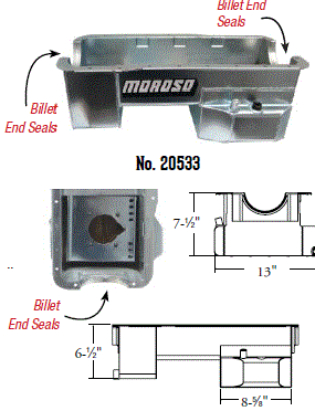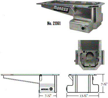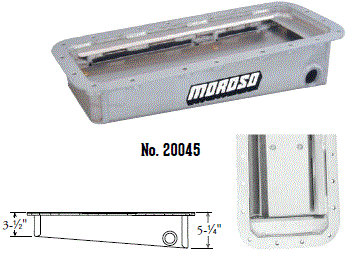 Deep Engine Application: 351W Fits: 1979-up Mustang, 1981-88 Thunderbird & Cougar, 1979-86 Capri and other Ford rear sump applications Steel with a clear zinc finish Billet end seals for greater sealing than a core based oil pan Kick-out for maximum horsepower 9" deep rear straight sided sump to clear headers Clears all 4-bolt main caps including 4-bolt rear Accepts 4.0" stroke with most steel rods Oil sump retaining system Compatible with most starter/flywheel combinations For use with oil pan gasket Moroso No. 93162 $57.90 |