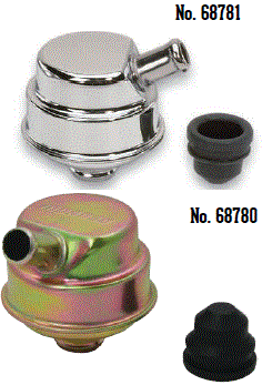 | 68741 $13.37 * | One Piece Push-In Valve Cover Breathers, Steel, Chrome Plated, for street cars that require a PCV set-up. Contains one breather with valve cover grommet and one PCV valve grommet |
