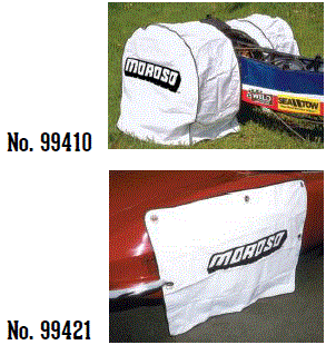 TIRE COVERS Moroso Tire Covers keep tire pressures consistent by blocking hot rays Made from a rugged 6 mil vinyl reflecting outer surface laminated to an insulating backing of polyscrim Completely washable and available in two different styles No. 99410 $70.15 fits right over the tire and is held securely in place by a 4"rear flap No. 99421 $60.74 uses suction cups and hangs like a curtain against the body |