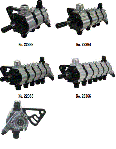 Dry sump oil pumps, DragstEr Single, Three, Four, Five and Six Stage Fits: Chevrolet-based Small Block & Big Block Dragster applications Steady oil pressure throughout RPM range Consistent oil pressure at high heat levels Increased vacuum Consistent oil pressure at high vacuum levels Oil pressure adjustability, allows for finer tuning of pressure levels Internal manifold with 16AN return, no need for separate manifold Built-in bracket mounts pump higher and closer to the engine, for better engine compartment packaging in a Dragster Two pressure outlet locations for easier plumbing Includes all necessary fittings Vertical oil pressure adjuster makes it easier to change oil pressure settings |