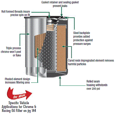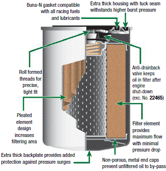| Oiling system equipment, oil pump accessories, remote filters, oil accumulators, adapters, filter mounts, oil valves, solenoids, oil filters & screens, filter fittings, application chart, engine magnets, warning light, oil pressure gauge, crankcase evacuation system, baffles, vents, oil restrictor kits, oil deflector, preheaters, heating pads, AN port plugs, AN Fittings, weld-on AN bungs, weld-on NPT bungs & other parts. |
