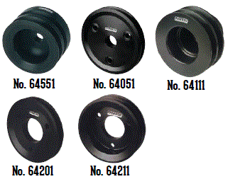 | 64201 $101.18 | Crankshaft Pulley, Billet. single groove, 30% reduction, 5.25" O.D. Fits: BBC, 1968-earlier (with short water pump) |