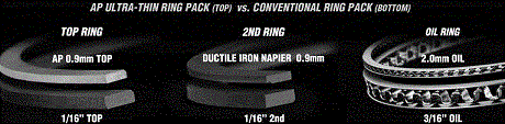 NEW TOTAL SEAL® AP ULTRA-THIN RING PACKS OFFER MAXIMUM EFFICIENCY AND SIGNIFICANTLY REDUCED FRICTION FOR NORMALLY ASPIRATED ENGINES. New Total Seal® AP Ultra-Thin piston ring packs feature 0.9mm, 0.9mm, 2.0mm ring sets. They include AP Advanced Profiling Steel top rings, ductile iron Napier 2nd Rings (in most sets where available) and standard tension oil rings. Thinner combination of AP Ultra-Thin Rings dramatically reduces friction .125 radial depth for excellent bore conformability Reduced stack height permits use of a piston with a very short compression height allowing the use of longer connecting rods, and/or increased strokes while keeping the wrist pin out of the oil ring groove |