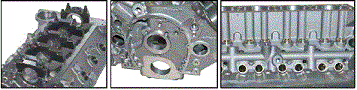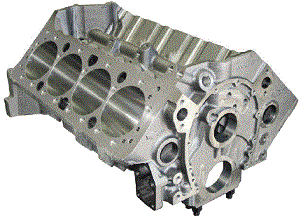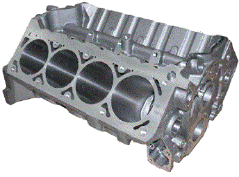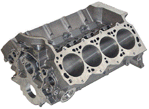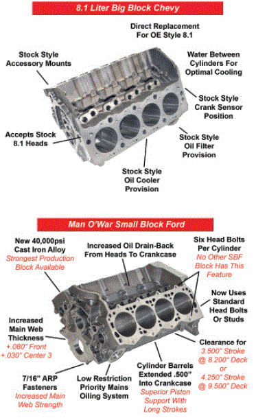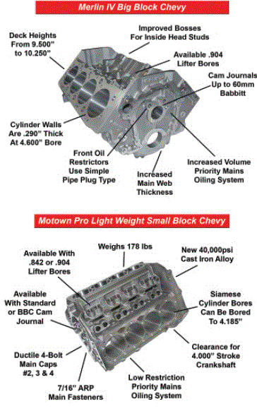 = 40,000psi cast iron construction = 178 lbs. average weight = Standard SBC or BBC 2.120 cam bore = .842 or .904 lifter bores = Clearance for 4.000 stroke = Priority main oiling = Expanded water jackets = Bores to 4.185 = 350 mains = 9.025 stock deck height = Splayed 4-bolt main caps on #2, 3 & 4 = Ductile main caps = ARP main bolts = Provision for oil restrictors = OE style fuel pump & starter mounts |
