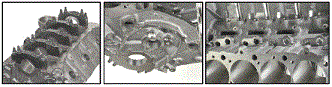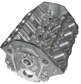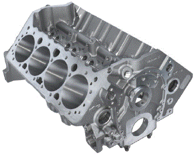 = High density cast iron construction = Raised cam location +.134" = BBC 2.120 cam bearing bore = Bushed lifter bores (.842 or .904) = Clearance for 4.000 stroke w/H-beam rods = Priority main oiling = Expanded water jackets = Bores to 4.200 (4.120 std.) = Cylinder walls .250 @ 4.200 = 350 or 400 mains = 9.025 stock deck height = Splayed 4-bolt billet main caps w/dowels & stepped register, ARP studs = Dual motor mounts = Provision for dry sump = OE style fuel pump & starter mounts = Approximately 200 lbs. |