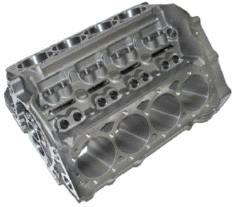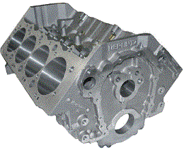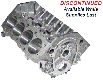 NEW 396 Style Block with 4.120 Bore Non-Saimese PN 091090 = High density cast iron construction = Priority main oiling = Front oil inlet and restrictor provision = Bores to 4.625 (4.245, 4.495 or 4.595 std.) = Cylinder walls .310 @ 4.600 = Valley accomodates OE roller lifters or use +.300 tall aftermarket lifters = 9.500 to 10.250 deck heights = Clearance for 4.750 stroke (10.200 deck) or for 4.375 stroke (9.800 deck) = Splayed 4-bolt main caps w/dowels & stepped register, ARP fasteners = 2.120 BBC cam bearing bore = Available 55mm babbit cam & .904 lifters = OE style fuel pump & starter mounts = Approximately 270 lbs. |